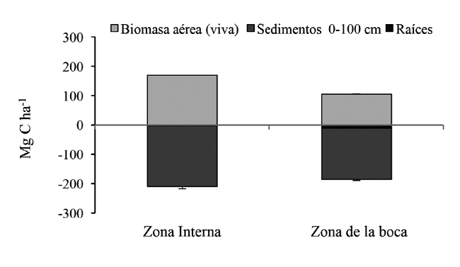 El carbono almacenado en la biomasa aérea viva registró diferencias significativas entre zonas (p = 0.006), siendo mayor en la zona interna (169.3 Mg C ha-1 ± 1.1 Mg C ha-1), con respecto a la zona de la boca (105 Mg C ha-1 ± 1.3 Mg C ha-1) (Fig. 3). El carbono almacenado en la bio-masa viva subterránea (raíces finas) no registró diferencias significativas entre sitios (p > 0.05), siendo mayor en la zona de la boca.