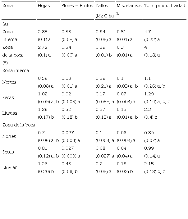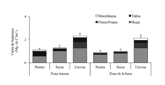 La caída de hojarasca promedio de la zona interna fue de 4.7 Mg C ha-1 año-1 ± 0.77 Mg C ha-1 año-1 mientras que la zona marina presentó un valor de 4 Mg C ha-1 año-1 ± 0.38 Mg C ha-1 año-1; y no se observaron diferencias significativas entre zonas (Tabla 2A). El componente principal de la caída de hojarasca fueron hojas que representaron 60.7% de la biomasa anual en la zona interna, mientras que en la zona de la boca las hojas representaron 69.2%. No se observaron diferencias significativas entre sitios (Tabla 2A).