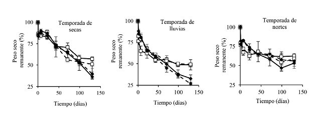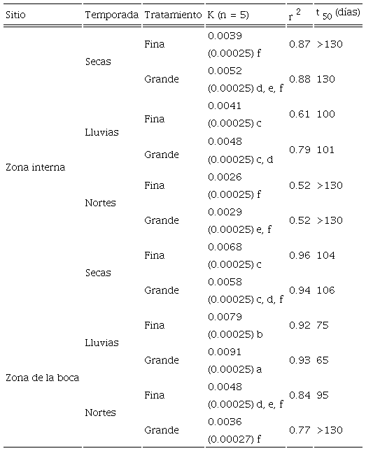 Alcanzar el tiempo en el cual se pierde 50% de la masa (t50) requiere de 9 a 17 semanas (Tabla 4). Durante la temporada de lluvias la tasa de descomposición fue más alta, este patrón ocurrió en ambas zonas (Fig. 5). Para la temporada de nortes se registraron las tasas de descomposición más bajas, ya que puede tomar más de 17 semanas llegar al valor del t50.