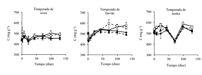 La concentración de carbono total (CT) en la descomposición de R. mangle muestra disminución inicial en las primeras semanas, la cual ocurre por la lixiviación de compuestos solubles como taninos que representan de 5% a 6% de hojas senescentes y carbohidratos no estructurales como azúcares y almidones, los cuales pueden ser fácilmente utilizados por microorganismos (Benner, Peele y Hodson, 1986; Mfilinge, Atta y Tsuchiya, 2002). En este estudio, posterior a la disminución de la concentración de CT, hubo un incremento en ambas zonas y en diferentes épocas, lo cual se debió probablemente a la lenta degradación de carbohidratos estructurales como lignina y celulosa, los cuales constituyen la mayor fracción de la biomasa de la hojarasca en descomposición y tienden a ser muy resistentes, y a la incorporación de carbono de bacterias y hongos que contribuyen a largo plazo a la descomposición total e incorporación a los sedimentos del humus formado (Mfilinge et al., 2002, Teutli-Hernández 2017).