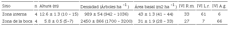 En la zona de la boca, de acuerdo con el índice de importancia, 66% le correspondió a A. germinans, 27% a R. mangle y 7% a L. racemosa. La altura promedio del bosque es de 5.8 m y el área basal fue de 31 m2 ha-1. En general se observó que la zona interna se encuentra con mejor estructura respecto a la zona de la boca (Tabla 1).