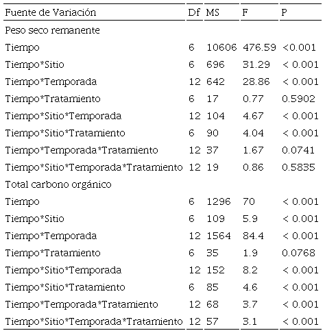 La concentración de carbono orgánico durante la descomposición de R. mangle varió significativamente en tiempo, sitio y temporada. El efecto del tamaño de malla no fue significativo (Tabla 3).