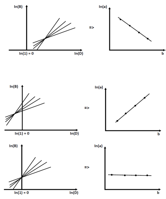 Para establecer una relación entre la constante (ad) y el exponente (bd) para un conjunto de parámetros del modelo alométrico de la relación (2) de diferentes especies de arboles o de la misma especie y diferentes sitios de muestreo, se puede partir de la propiedad de que los parámetros de un conjunto de líneas rectas que se intersectan en un punto común tienen una relación lineal entre ellos (Paz, Odi, Cano, Bolaños y Zarco, 2009). En el caso de las relaciones alométricas discutidas previamente, particularmente la ecuación (2), se tiene que con una transformación logarítmica se consigue: