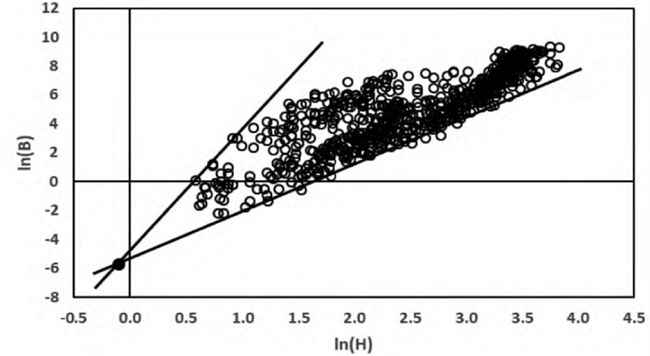 La figura 7 muestra la relación entre ln(ad) - bd de la relación ln(D) - ln(B), que muestra un patrón con una zona de intersección común definiendo relaciones entre la intersección de las líneas ln(D) - ln(H) con las líneas ln(D) - ln(B).