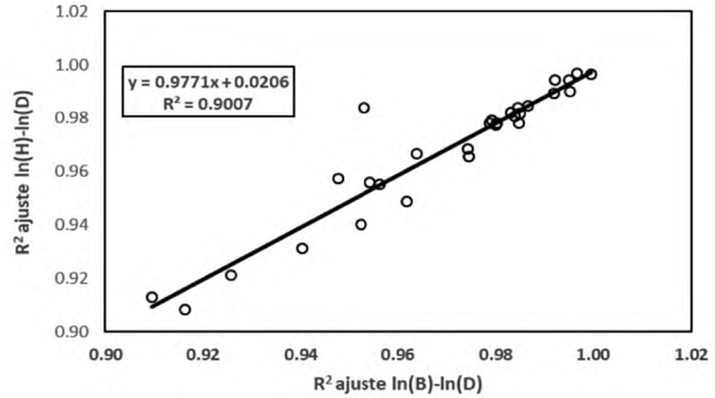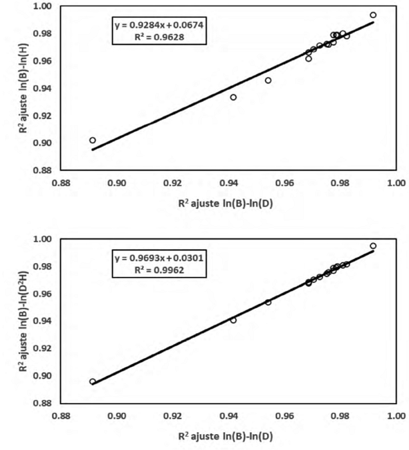 La figura 11 muestra la relación entre los coeficientes de determinación (R2) ajustados a los datos de las líneas rectas ln(H) - ln(B), donde se observa que los errores en las rectas ln(H) - ln(B) son directamente proporcionales a los de las rectas ln(D) - ln(H).