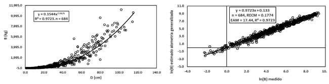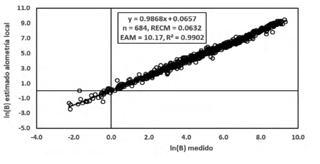 El desarrollo de ecuaciones generalizadas puede ser realizado con los métodos presentados basados solo en información de los datos D-H, medidos comúnmente en campo, sin la necesidad de contar con información de la biomasa aérea total (B). Este enfoque permite contar con un modelo aproximado generalmente con errores de estimación iguales o menores que el procedimiento clásico de generar ecuaciones usando ajustes estadísticos (Chave et al., 2014; Feldpausch et al., 2012).