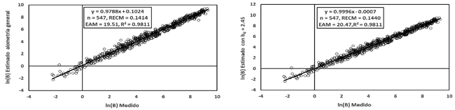 A partir del punto de intersección (-0.511, -3.4) en el espacio ln(D)-ln(B), es posible definir un valor constante para bd y estimar la biomasa aérea total. El problema de esta aproximación es que los valores óptimos (minimización del error de estimación) tienen diferentes patrones que dependen del valor de bd. Para valores de bd mayores de 2 y hasta un valor aproximado de 3, la figura 13 muestra los resultados obtenidos con bv = 2.45, así como las estimaciones usando una ecuación alométrica general caso de las 20 bases de datos que cumplen la restricción en bd; (Tabla 2). Se observa en la figura 13 que los errores de estimación del uso de bd fija (optimizada) fueron similares al caso de uso de un modelo alométrico general.