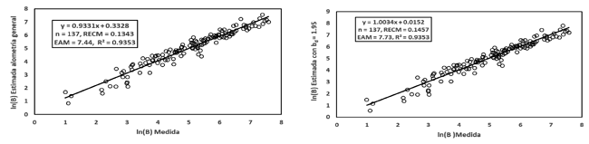 Para cada línea recta entre ln(D) - ln(H) ajustada a los datos de la figura 6 se ajustaron a estos datos líneas rectas entre ln(D) - ln(B), ln(H) - ln(B) y ln(D2H) - ln(B).