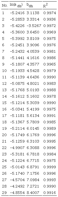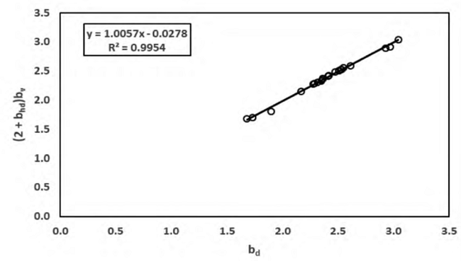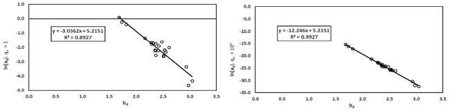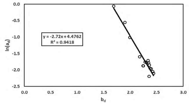 La figura 15 muestra la relación entre ln(ad) y bd para todas las bases de datos de la tabla 2, donde se observa una relación lineal congruente con lo esperado, ecuación (17), usando un valor de qx = 1 (D en cm) en la ecuación (23). En la misma figura 15 se observa el caso de usar qx = 104, donde en la relación entre ln(ad) y bd se mejora en su correlación.