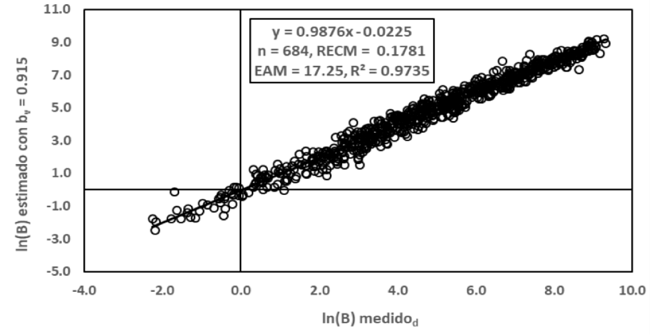 Si el objetivo es estimar B con la ecuación (1) o (2), las relaciones (7) u (8) y (9) establecen que para el caso bv = 1 es posible obtener el valor del coeficiente bd del coeficiente bhd. Si se desconocen av y bv, entonces no es posible establecer una relación simple con ad y bd. Price et al. (2007), Návar (2010) y Zhang et al. (2016) encontraron las mismas relaciones en el contexto del modelo WBE (West, Brown y Enquist) de ramificación fractal de plantas vasculares (West, Brown, Enquist, 1999) y, bajo la consideración de bv = 1. A diferencia de este enfoque teórico, los desarrollos que se presentan son consecuencia directa del sistema de ecuaciones definido, sin ninguna consideración de tipo teórico, solo derivaciones matemáticas simples.