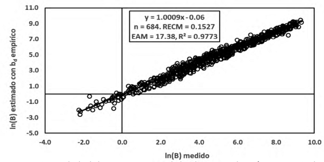 La relación entre ambas variables está dada por [bd est] = 1.77 - 0.3048[ln(ad) est], R2 = 0.9653, que implica una zona común de intersección.