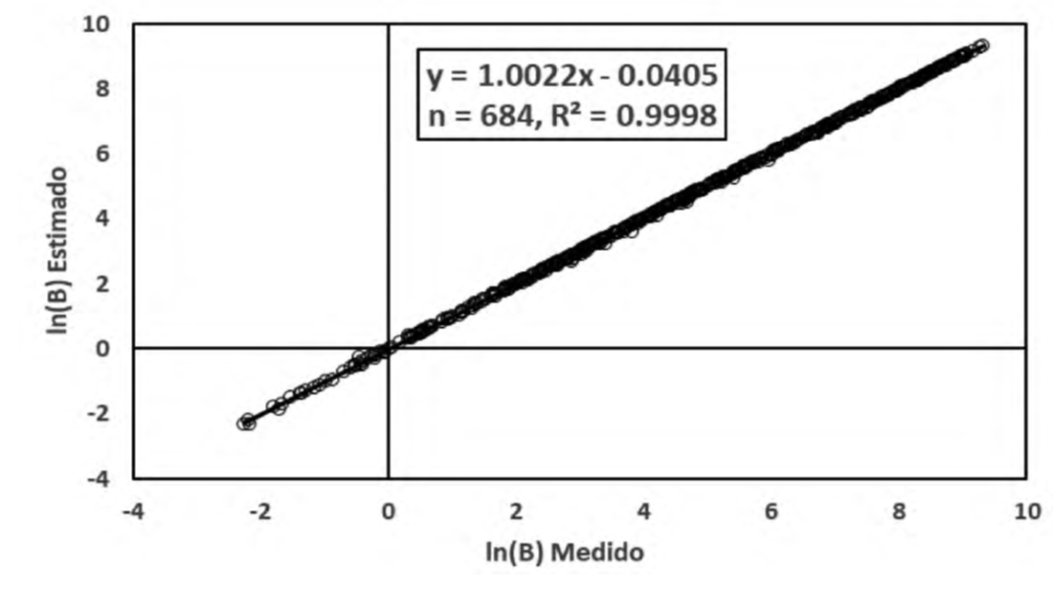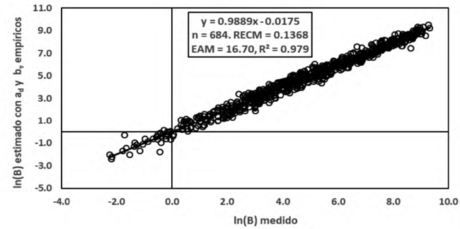 La figura 17 muestra las estimaciones de ln(B) utilizando bd de la ecuación (36) y la relación entre ln(ad)-bd para qx = 1 (Fig. 15), donde se observan estimaciones con error menor que en el caso de usar una regresión generalizada.