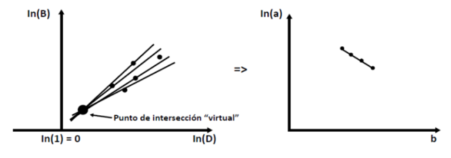 Para el caso de la relación (1), con líneas rectas en el espacio log-log que se intersectan en un punto, se tiene: