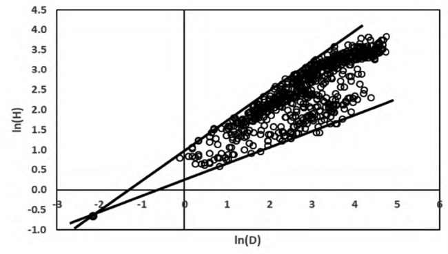 Con base en la metodología mostrada en la figura 2, la figura 6 muestra la relación D-H para toda la base de datos, donde se estableció un punto de intersección general en (-2.15, -0.65). Para cada par de datos se determinó su pendiente usando el dato del punto de intersección y los datos fueron ordenados de acuerdo con los valores de las pendientes para establecer líneas rectas ln(H) = ahd + bhdln(D), agrupando valores comunes de pendientes en forma no traslapada. La tabla 3 muestra los parámetros de las líneas rectas definidas en el proceso, donde los ajustes estadísticos muestran pequeños errores de estimación.