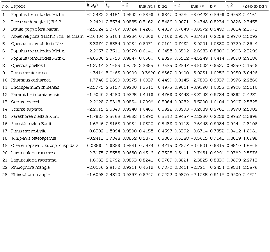 Cada base de datos (Tabla 1) se procesó para estimar los parámetros de las relaciones B-D, H-D y B-D2H, ecuaciones en el espacio transformado log-log. La tabla 2 muestra los parámetros estimados por regresión lineal ordinaria en el espacio log-log con sus coeficientes de determinación asociados a este espacio.