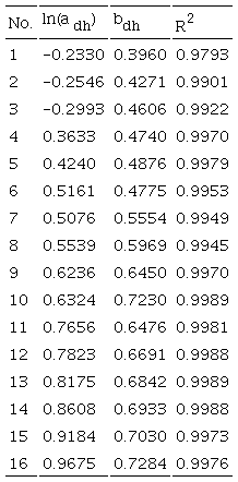 En la tabla 2 se muestran los parámetros de la relación (9) entre los exponentes, la cual se cumple bien (Fig. 3). Para estimar los parámetros de las relaciones B-D2H,B-D y H-D, ecuaciones (1), (2) y (4), se definió un punto de intersección de las líneas ajustadas (ver esquema en la Fig. 2). El valor seleccionado fue D = 0.6, ln(D=0.6) = -0.511, mismo valor usado también para D2H. El valor de B, relación (2), se estimó de la ecuación ajustada (Tabla 2) para cada base de datos, cuyos parámetros siguen el patrón mostrado en la figura 2. El valor de intersección [ln(0.6, ln(ad)+bdln(0.6)], espacio B-D, fue usado para estimar los parámetros de las líneas analizadas en el espacio log-log al usar cada dato de las bases (especies) analizadas, ya con dos puntos se definió la ecuación de la línea recta. Puesto que se conoció el punto de intersección (constante ad), entonces solamente es necesario estimar bd usando la relación (9), figura 3. La figura 4 muestra los resultados obtenidos por este procedimiento, donde el error de estimación es prácticamente nulo.