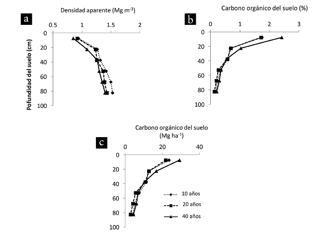 La figura 1 muestra el tamaño del almacén total de COS en cada perfil cavado en las unidades experimentales y el de sus respectivos incrementos de profundidad, se obtuvo de los resultados de los análisis de COS y densidad aparente. Esta última incrementó con la profundidad del suelo en los bosques, independientemente de la edad (Fig. 1a). En los primeros 15 cm del suelo, la densidad fue ligeramente menor a 1.0 Mg m-3, se incrementó con la profundidad alcanzando 1.40 Mg m-3, 1.43 Mg m-3 y 1.53 Mg m-3 en la capa 75 cm a 90 cm en los bosques de 40 años, 20 años y 10 años, respectivamente. En los primeros 15 cm la densidad aparente no presentó diferencias significativas (p > 0.05) entre los bosques de diferente edad, pero en el incremento de profundidad 15 cm a 30 cm del bosque de 40 años, esta resultó ser significativamente menor (p < 0.05) que en los bosques de 10 años y 20 años. La densidad aparente de la profundidad 30 cm a 90 cm del bosque de 10 años fue significativamente mayor (p < 0.05) que en los bosques de 20 años y 40 años, entre los que no se observó diferencia significativa.