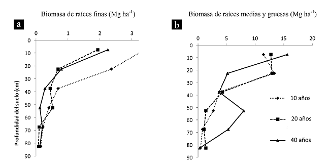 La proporción de la biomasa de las raíces gruesas y medias en los primeros 15 cm, en contraste con la biomasa de las raíces finas, estuvo por debajo de 40% en los bosques de 40 años, 20 años y 10 años (38.1%, 33.8% y 32.4%, respectivamente). En los primeros 30 cm, los bosques más jóvenes (20 años y 10 años) concentraron 76.2% y 76.6% de esas, respectivamente, valor que contrastó con el bosque de 40 años, que concentró 54.6% del total de la biomasa de raíces gruesas y medias en esa profundidad.