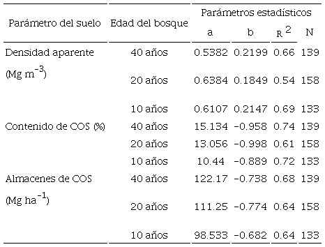 La densidad aparente del suelo se relacionó positivamente con el aumento de la profundidad del suelo, independientemente de la edad del bosque. Al cambio de esta variable con la profundidad del suelo se le ajustó un modelo de formato exponencial (Yi = a(Z)b). Los parámetros “a” y “b” del modelo no presentaron diferencias, y los coeficientes de determinación (R2) fueron mayores a 0.65 en los bosques de 40 años y 10 años, mientras que, en el bosque de 20 años, el coeficiente de determinación fue menor a 0.6 (Tabla 1).