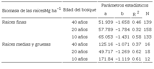 Los modelos exponenciales ajustados para representar la distribución vertical de la biomasa de las raíces finas presentaron una tendencia similar en los bosques de las tres edades con valores del parámetro estadístico “a” que decrecían conforme aumentaba la edad del bosque. Los valores de los parámetros “a” y “b” se presentan en la tabla 2. Los coeficientes de determinación (R2) del modelo de regresión de las raíces finas fueron 0.46, 0.32 y 0.58 para los bosques de 40 años, 20 años y 10 años, respectivamente. Dichos coeficientes de determinación se explican por la variabilidad de las raíces finas en el perfil del suelo en cada bosque, la cual fue mayor para el bosque de 20 años, y por la probabilidad de pérdida de estas en el proceso de separación.