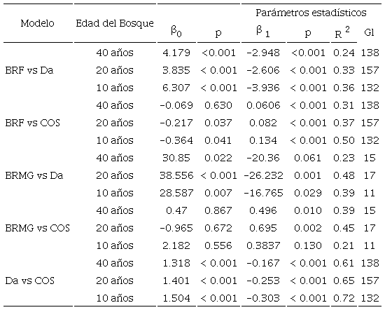 La biomasa de las raíces gruesas y medias también se asoció inversamente con la densidad aparente, las intersecciones de los modelos con la ordenada al origen tuvieron diferencias significativas (p < 0.05). Cuando se estableció la relación de estas con la pendiente se observó que las diferencias eran significativas (p < 0.05) solo en el caso de los más jóvenes. Como ocurrió con las raíces finas, los coeficientes de determinación (R2) fueron bajos, por la dispersión natural de los datos registrados. Al relacionar la biomasa de las raíces gruesas y medias con el COS, la ordenada al origen de los modelos fue estadísticamente igual y la pendiente presentó diferencias significativas (p < 0.05), solo en el caso de los bosques de 40 años y 20 años, pero los coeficientes de determinación (R2) fueron bajos.