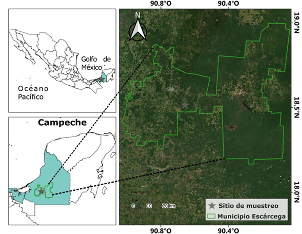 La investigación fue realizada en una superficie de 8.0 ha de vegetación secundaria arbórea, derivada de la selva mediana subperennifolia del municipio de Escárcega, Campeche, México. El sitio se localiza en las coordenadas 18° 30' 52'' N y 90° 39' 23'' O, a una altitud de 60 m (Fig. 1). El clima, de acuerdo con la clasificación de Köppen modificada por García (2004) corresponde a cálido subhúmedo con lluvias en verano A(w1), con temperatura media anual de 26 °C, máximos de 42 °C y mínimos de 4.5 °C. La precipitación media anual es de 1300 mm. El tipo de suelo del lugar corresponde a un vertisol (Instituto Nacional de Estadística Geografía e Informática [Inegi], 2007).