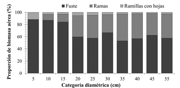 El porcentaje de biomasa aérea en cada componente del árbol de P. piscipula fue afectado por Dn del árbol (Fig. 2). Tal es el caso de las hojas, donde la proporción de biomasa mostró un comportamiento de disminución con el aumento del Dn, esta tendencia se explica porque, a medida que los árboles crecen, la producción de biomasa foliar en ramas tiende a decrecer por el envejecimiento (Mensah et al., 2016). Por el contrario, el aporte relativo de las ramas a la Bt fue mayor con el incremento del diámetro, lo que indica que los árboles invierten una mayor proporción de biomasa en ramas que la del fuste como una estrategia de crecimiento para competir con los árboles vecinos al crecer en altura y expandir el área de la copa para acceder a recursos limitantes y sombrear a sus competidores (Mensah et al., 2016; Dimobe et al., 2018).