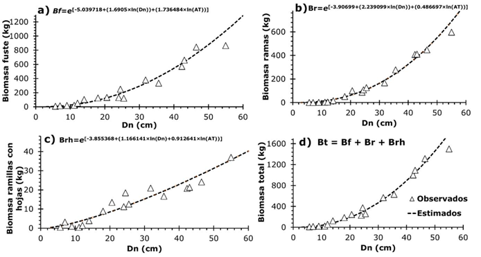 Los dos sistemas de ecuaciones alométricas generados en este estudio presentaron excelentes estadísticos de ajuste y precisión en las estimaciones de biomasa, debido a que se incluye como variables independientes a la variable combinada del Dn y AT. Distintos autores han demostrado que al incluir la AT como variable predictiva, combinada con el DN en un modelo alométrico de biomasa, mejora la calidad de predicción, especialmente en especies de árboles tropicales (Aquino-Ramírez et al., 2015; Xue et al., 2016; Mensah et al., 2016). El uso de la AT permite tomar en cuenta la variación en Bt entre árboles cuando se tiene el mismo valor de Dn, disminuyendo así los errores de predicción (Picard et al., 2015).
