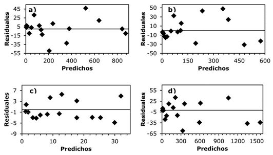 Las ecuaciones alométricas ajustadas del S1 que más explicaron la variación en la biomasa fueron para Bt, Bf y Br (> 97 %), y un menor grado para Brh (89 %). La capacidad predictiva de las ecuaciones alométricas del S1 frente a los valores observados manifestó un comportamiento muy aceptable (Fig. 3). Además, los gráficos de dispersión de los residuales contra valores predichos en todas las ecuaciones de biomasa presentaron una tendencia homoscedástica (Fig. 4).