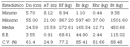 Antes del derribo, a cada árbol se le midió el diámetro normal (Dn) con cinta diamétrica a una altura de 1.30 m desde el nivel del suelo, en tanto que la altura total (AT) fue medida con cinta métrica después del derribo. Los árboles extraídos fueron separados en ramillas con hojas (diámetro < 1.0 cm), ramas y fuste. El peso fresco total de cada componente fue obtenido en campo con una báscula digital de 500 kg de alcance, con una resolución de ± 0.5 kg.