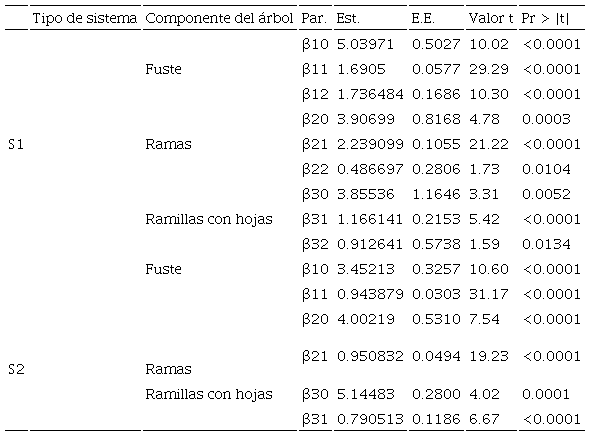 Los coeficientes de las ecuaciones en cada sistema (S1 y S2) fueron estimados simultáneamente empleando el método generalizado de momentos (MGM) con el procedimiento PROC MODEL del programa Statistical Analysis System [SAS/ETS®], 2002). El MGM es útil para obtener estimaciones de parámetros eficientes en un sistema de ecuaciones con términos de error heteroscedástico sin especificar su naturaleza en una muestra pequeña (Greene, 1999; Wang et al., 2018) y, por lo tanto, se evita la dificultad de obtención de funciones de ponderación de los componentes de biomasa que describan con precisión el diseño de la matriz de varianza del error (Bi et al., 2010).