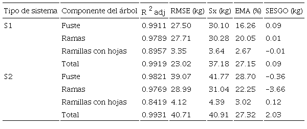 as ecuaciones de distribución de biomasa en los dos sistemas presentaron coeficientes de R2adj superiores a 0.84, siendo los más altos para la biomasa del fuste y ramas y los más bajos para la biomasa de las ramillas con hojas; mientras que para la Bt fueron superiores a 0.99 (Tabla 3). Los resultados de bondad de ajuste indicaron que las ecuaciones alométricas del S1 presentaron valores más bajos de RMSE (< 27.7 kg), Sx (< 37.2 kg), EMA (< 27.2%) y sesgo (< 0.09 kg) que los obtenidos en el S2 (Tabla 3).