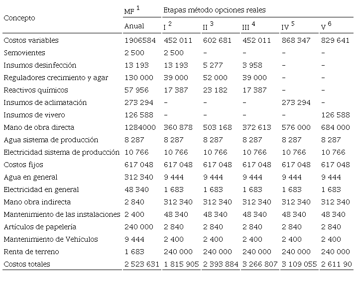 La sumatoria de los costos variables y costos fijos es igual a los costos de producción de plantas in vitro, en esta investigación esos valores fueron divididos por etapas. El valor de los costos variables referidos en la tabla se utilizó para calcular los árboles recursivos en los dos escenarios planteados en el método por opciones reales.