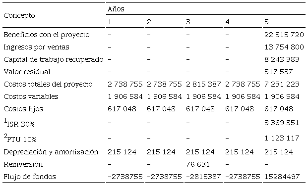 El VAN se calculó considerando un horizonte de cinco años. La TREMA fue de 25%; se consideró un riesgo de inflación de 5% y la utilidad del inversionista de 20%.