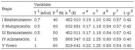 Probabilidad de éxito de pasar a la siguiente fase La probabilidad de éxito se estimó de acuerdo con los resultados obtenidos del Laboratorio de Biorreactores de frutales y del área de producción de árboles frutales del Colegio de Postgraduados y de los resultados obtenidos por Roussos y Pontikis (2002); según lo anterior, se establecieron los siguientes parámetros: porcentaje de establecimiento de 60% con una tasa de multiplicación de 10 nudos por explante; los porcentajes de las siguientes etapas fueron: enraizamiento 70%, aclimatación 75% y vivero 80%; además, se adicionó un factor de probabilidad de superar cada etapa de 80% debido a las pérdidas ocasionadas por el nivel de experiencia del personal. Asi mismo, se determinó la duración en años en cada una de las etapas: establecimiento 0.7; multiplicación 0.5; enraizamiento 0.5; aclimatación 1 y vivero 1.