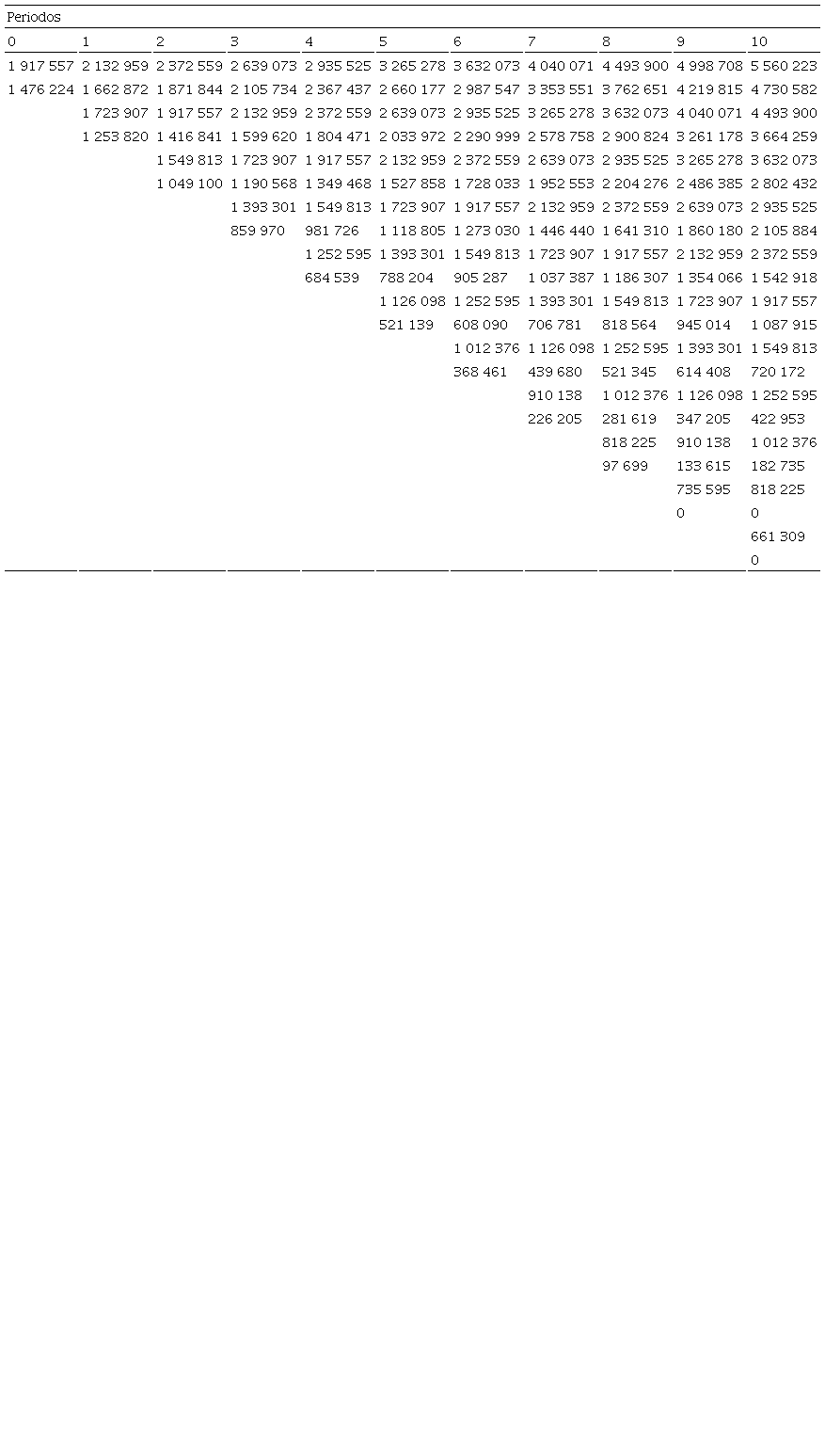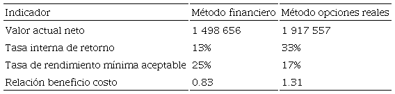 El flujo de beneficios que se presenta en la Tabla 4 contiene la información condensada para calcular los indicadores financieros correspondiente al método por opciones reales.