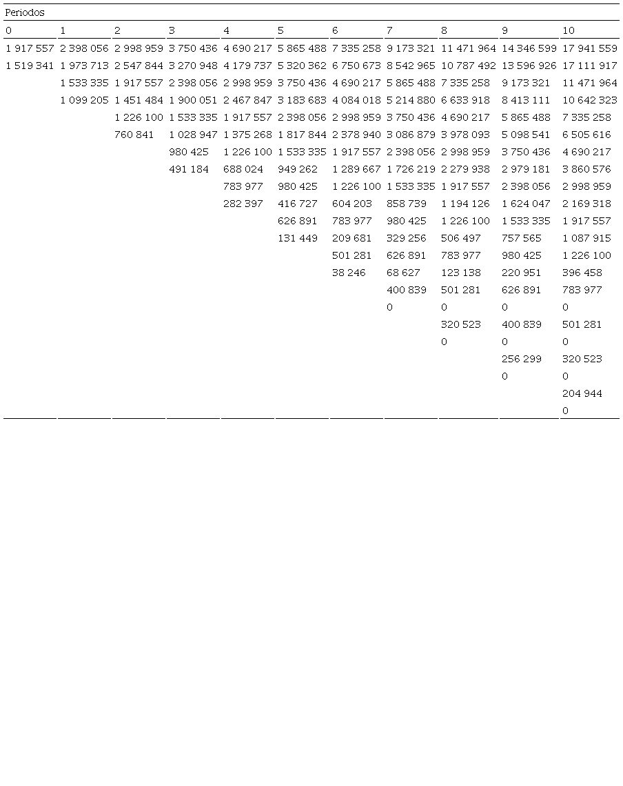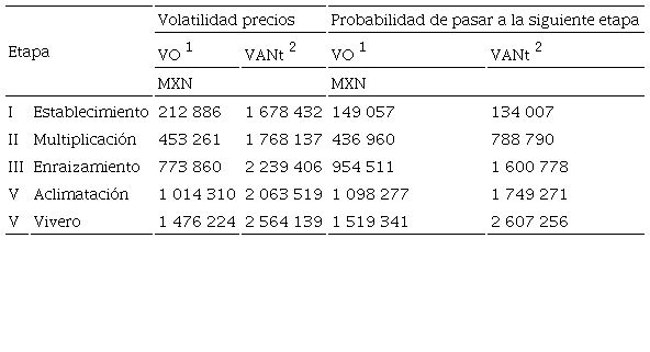 El cálculo del valor de la opción considerando la volatilidad de los precios inicia con la etapa V de vivero, seguida de las etapas IV de aclimatación, III de enraizamiento, II de multiplicación y la I de estable-cimiento. El primer valor de MXN 1 917 557 es el VAN (Tabla 6) calculado a partir de los datos de la tabla 5.
