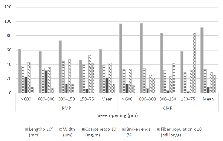 The FP was lower in RMP (1,261 × 106 g-1) than in CMP (2,542 106 g-1). For both pulps, this parameter was lower than the range (10,0-15,0 million/g) indicated for hardwood fibers by Hillman (1998). There was an inverse relationship between the FP and the coarseness. Notably, the CMP fibers had an advantage: they had numerous available links per unit length due to their low coarseness and high FP compared to the RMP case (Nordström & Hermansson, 2018).