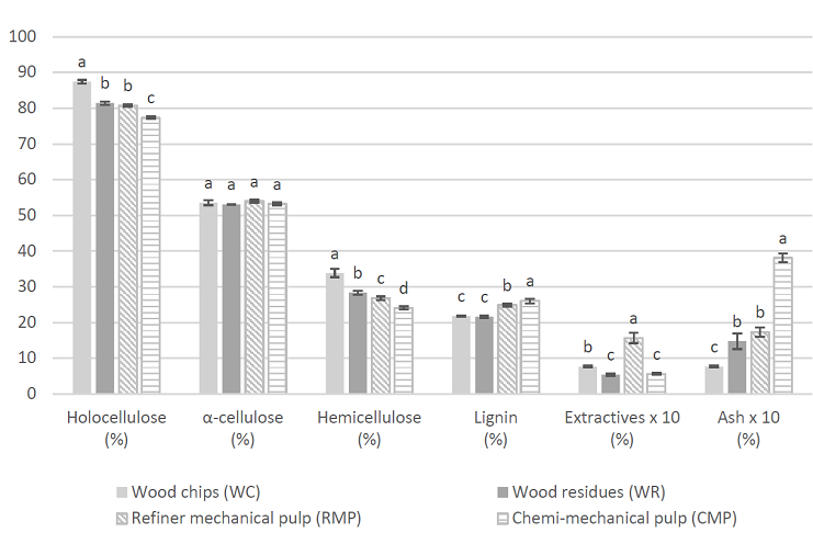 The chemical compositions of the WC, WR, RMP, and CMP were compared (Fig. 4). ANOVA was performed for each of the chemical components, and only α-cellulose did not show significant differences between the samples.
