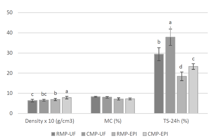 Regarding the IB, the CMP-EPI (0,64 MPa) treatment produced the highest values, whereas the other three treatments (RMP-UF: 0,46 MPa; CMP-UF: 0,42 MPa; RMP-EPI: 0,46 MPa) produced resistance without significant differences between them. The best resistance of the CMP-EPI boards is attributed to their high density and greater number of bonds between the fibers and the EPI resin, given its high adhesion resistance (Guo et al., 2018).