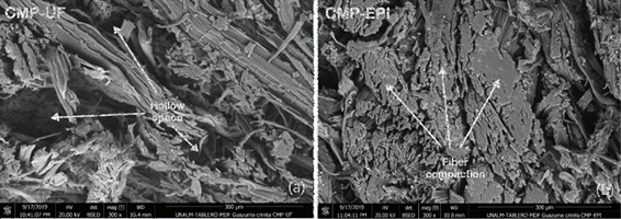 The density values of RMP-EPI (694,43 kg/m3) and CMP-EPI (788,31 kg/m3) were higher than those of RMP-UF (641,70 kg/m3) and CMP-UF (658,91 kg/m3). As shown in Figure 6, there is a greater proximity between the fibers in the boards with EPI than with UF; this is because the density is related to the porosity or the proportion of hollow space volume (Shmulsky & Jones, 2011). Both resins achieved a better bonding between the fibers with the CMP. The CMP-EPI treatment exhibited the highest board density (788,31 kg/m3) (Fig. 5).