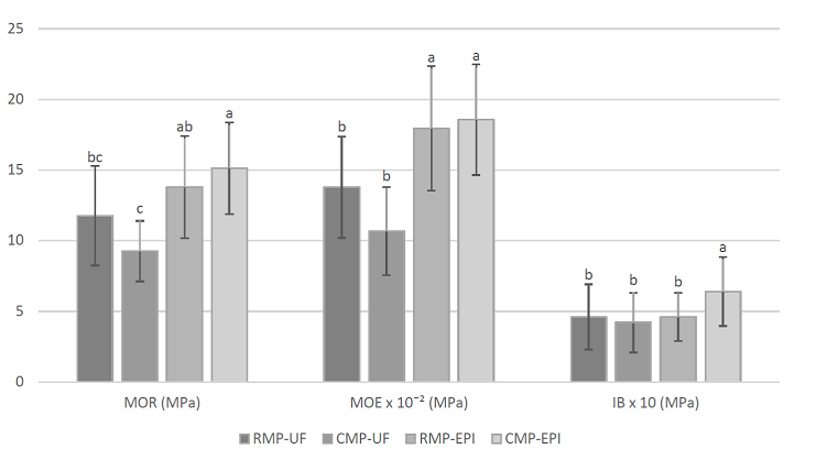 The MOE of the CMP-EPI (1856,79 MPa) and RMP-EPI (1794,52 MPa) boards were better than those of the CMP-UF (1068,00 MPa) and RMP-UF (1378,70 MPa) boards (Fig. 7). The greater rigidity of the EPI boards is attributed to the better performance of the EPI over the UF.