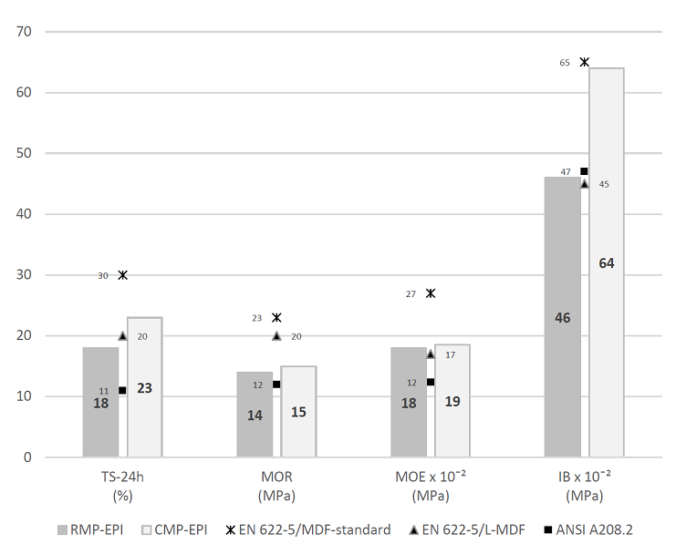 The values of the physical and mechanical properties of the MDF made with CMP-EPI and RMP-EPI treatments were compared with the corresponding values shown in the European and American standards (Fig. 8). In the comparison of the physical and mechanical properties for MDF-standard presented in the EN 622-5 (CEN, 2009) standard, both the RMP-EPI and CMP-EPI boards complied with TS-24h. In comparison, when it is compared to the MDF light board (L-MDF) values of the same standard, the RMP-EPI board exceeded the requirements except for the MOR, whereas the CMP-EPI board satisfied MOE and IB requirements. In the case of the American National Standard Institute [ANSI] A208.2 (ANSI, 2009) standard, both of the mentioned boards complied with the MOR and MOE, but only CMP-EPI exceeded the IB. In general, the density achieved allowed the properties of the boards of the present study to exceed some standard values; however, it was insufficient because it did not fulfill all of them. The main reason was their bark content (5%) which has a detrimental effect on the physical and mechanical properties of MDF (Xing et al., 2006).