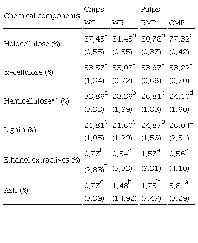WR, RMP and CMP were chemically characterized according to the TAPPI standards. Additionally, a bark-free wood (WC) sample was characterized to contrast the effects of bark. Holocellulose (Jayme-Wise's method), α-cellulose (T 203 cm-99; TAPPI, 1999), Klason lignin (T 222 om-98; TAPPI 1998), ethanol extractives (T 204 cm-97; TAPPI 1997), and ash (T 211 om-93; TAPPI 1993) contents were determined. The hemicellulose values were obtained from the difference between the holocellulose and α-cellulose values (Cruz et al., 2018). All chemical characterization tests were carried out in triplicate. The statistical analysis was carried out. analysis of variance (Anova) was performed with the data obtained. The pulps were subjected to multiple comparisons of means using the Tukey test.