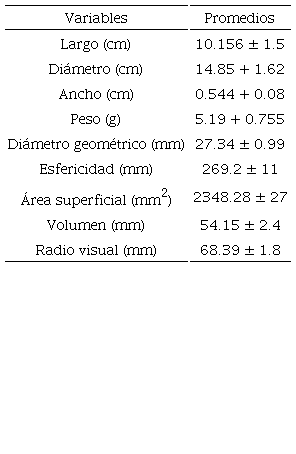 Para los análisis proximales y algunas propiedades físicas, las vainas fueron trituradas en un molino de 10 kg (Anself HC-2000) para obtener harina. Empleando un calibrador digital pie de rey, se midieron longitud, ancho y grosor de las vainas; con estas dimensiones de calcularon diámetro geométrico (D), esfericidad (ø), volumen (V), área superficial (S) y relación de aspecto (R), de acuerdo con la metodología propuesta por Hernández-Santos et al., (2014). Esta información es importante para determinar el efecto cinético sobre su flujo en bandas, separadores, máquinas de limpieza, entre otras, que permitan un mejor aprovechamiento industrial (Hernández-Santos et al., 2014).