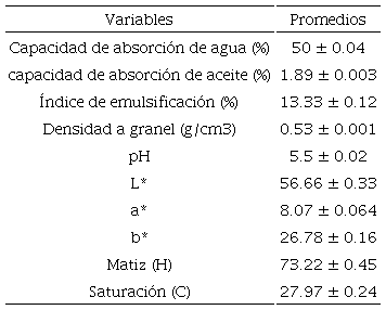 La capacidad de emulsificación se analizó de la siguiente manera, se mezcló la harina obtenida en agua destilada (relación 1:20 g/g), se agitó vigorosamente y se dejó reposar por 15 minutos; pasado este tiempo se mezcló con partes iguales de aceite vegetal (gramos) y nuevamente se agitó de manera vigorosa por tres minutos. Finalmente se centrifugó por cinco minutos a 10 000 min-1. El índice de emulsificación se expresó como porcentaje de la altura de la capa emulsionada con respecto al contenido total de líquido (Yasumatsu et al., 1992). Para determinar la capacidad de absorción de agua (WAC) y la capacidad de solubilidad en agua (CSM) se añadieron 10 ml de agua destilada a un gramo de muestra, posteriormente se agitó en un vórtex (Vortex-2 Genie, modelo G-560) durante 30 segundos y se centrifugó a 15 000 min-1 por 15 min (Centrífuga Universal Compact HERMLE Labortechnik GmbH Mod Z 200A). Se decantó el sobrenadante en una cápsula de porcelana tarada. La CSM se calculó como el peso del sedimento después de la eliminación del sobrenadante por unidad de peso inicial de sólidos en una base seca; mientras que la WAC se calculó como el peso seco de los sobrenadantes sólidos como un porcentaje de peso de la muestra original. Los resultados se expresaron como porcentaje de gramos de agua retenidos por gramo de muestra (Anderson et al., 1964).