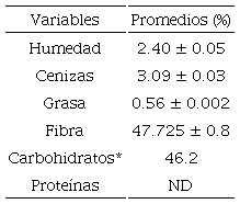 Para la determinación del contenido proximal se utilizaron los métodos oficiales de la American Association of Cereal Chemists (AACC, 1995); el contenido de proteína total por el método de Kjedahl (método oficial 46-13.01), fibra cruda (método oficial 32-10.01), cenizas (método oficial 08-03.01), grasa (método oficial 30-10.01) y humedad (método oficial 44-15.02). El contenido de carbohidratos se determinó por diferencia.