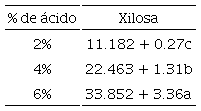 Otro aspecto que se evaluó en la harina fue la obtención de xilosa por medio de hidrólisis con ácido sulfúrico. La xilosa es una materia prima metabolizada por una gran diversidad de microorganismos, principalmente hongos. Sin embargo, las investigaciones se han centrado en la obtención de etanol y xilitol a partir de esta pentosa (Ledezma-Orozco et al., 2018). La hidrólisis se realizó con 2%, 4% y 6% de H2SO4 manteniendo una relación sólido/líquido de 1:6. Una vez añadido del ácido, la mezcla se llevó a la autoclave a 121 °C por 60 minutos después de los cuales, se enfrío, centrifugó y filtró para separar el jarabe rico en xilosa. La concentración de xilosa y ácido acético se determinaron mediante cromatografía líquida de alta eficacia (HPLC HP-1100) utilizando una columna Transgenomic ION-300, con una temperatura de horno de 45 °C y elución isocrática de 0.4 mL min-1 de flujo de fase móvil (H2SO4 0,0025 M) (Ledezma Orozco et al., 2018).