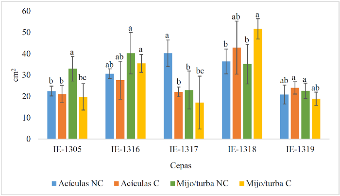 En relación con el vector utilizado, en todas las condiciones experimentadas se observó desarrollo micelial de las cinco cepas, aunque hubo variaciones de respuesta (Fig. 3). En promedio, los diámetros miceliales mayores correspondieron a las muestras cultivadas en mijo, aunque estadísticamente solo se lograron detectar diferencias significativas para los micelios criogenizados de Boletus aff edulis IE-1305. Por el contrario, la cepa de Helvella sp. IE1317 mostró mejor crecimiento en las muestras en acículas de pino, previo a la criogenización. En las tres cepas restantes se presentaron condiciones similares de desarrollo micelial en ambos vectores, especialmente para los cultivos de la cepa IE-1316.
