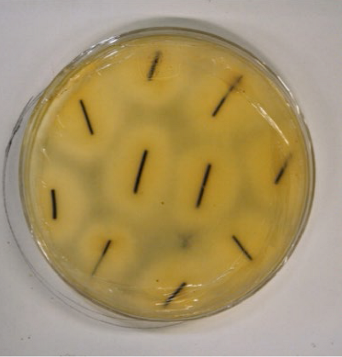 Las muestras permanecieron congeladas durante 30 días. Transcurrido este periodo, los viales se retiraron del contenedor de nitrógeno líquido y se descongelaron introduciéndolos en un baño maría preparado con agua destilada estéril a 30 °C, durante 10 min (Mata y Pérez Merlo, 2003). Una vez descongelados, los viales se desinfectaron durante 1 min en una solución de etanol al 70% (v/v), retirando el exceso de la solución protectora de glicerol y transfiriendo los vectores con micelio a cajas de Petri estériles.